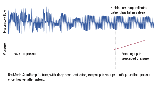 - 入眠検出機能を備えたAutoRamp™は、低圧から始動することで1患者さんの快適な入眠をサポートし2,3、眠りに落ちた後に、治療で定められたレベルまで加圧します。